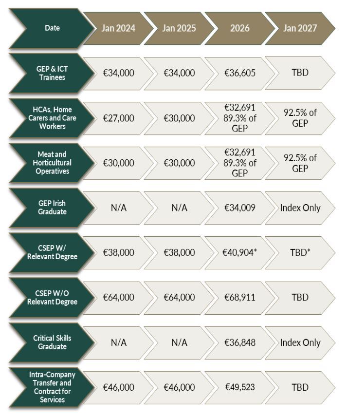 • NEW General Employment Permit minimum salary is €36,605 and €34,009 for Irish graduates.